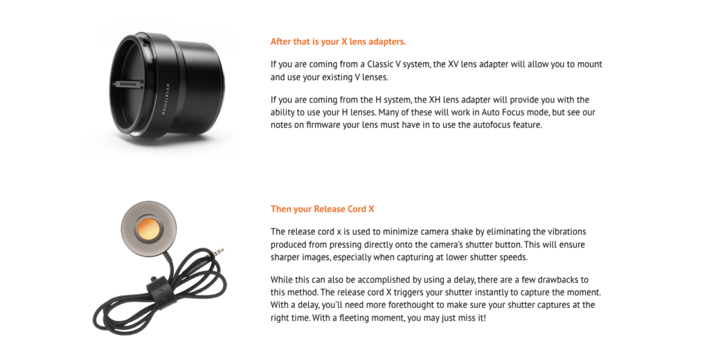 • Hasselblad는 V 시스템 렌즈를 사용할 수 있는 어댑터를 제공하여 과거의 필름 렌즈와도 호환이 가능하게 합니다. 또한, 접사 촬영을 위한 연장 튜브도 활용할 수 있습니다.